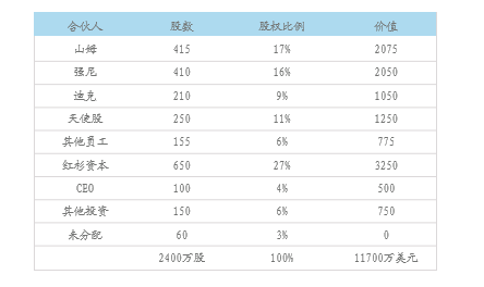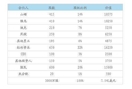 接下来,山姆等人辞去以前的职务,全职创业。公司很成功,半年后做出了产品的原型(Prototype)。但是,50万投资已经花完了,公司也发展到20多人。250万股票也用去了150万股。这时,他们必须再融资。由于该公司前景可观,终于得到了红杉风投的青睐。红杉风投为该公司作价1500万美元,这时,该公司的股票每股值1美元了,比亚平投资时涨了四倍。红杉同意投资500万美元,占25%,这样总股数增加到2000万股。同时,红杉风投将委派一人到该公司董事会任职。山姆等人还答应,由红杉风投帮助寻找一位职业经理人做公司的正式CEO。双方还商定,融资后再稀释5%,即100万股,为以后的员工发期权。现在该公司股权如下: