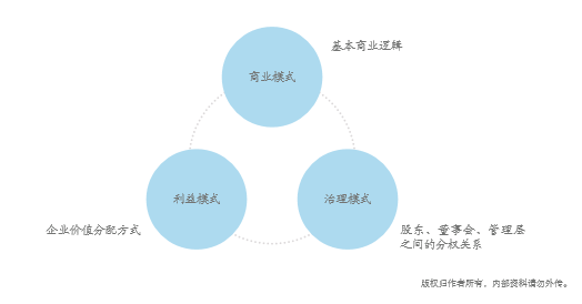 一般来说,企业的顶层设计包括商业模式、利益模式和治理模式。商业模式是企业的基本商业逻辑,利益模式指的是企业的价值分配方式,治理模式则是股东、董事会和管理层之间的分权制衡关系。如下图: