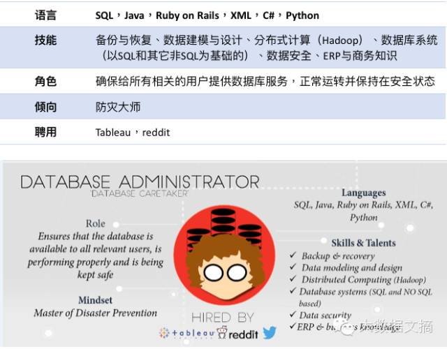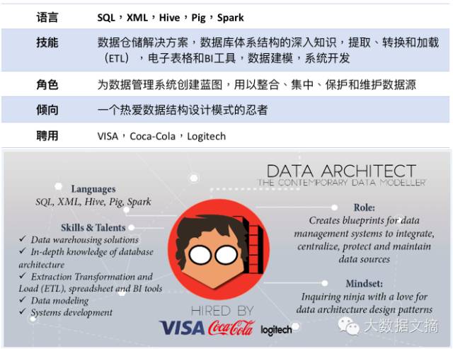 第二届世界互联网大会的召开,将大数据战略推向了又一高潮,许多与数据相关的职位如雨后春笋般涌现,数据科学家、数据分析师、数据架构师、统计学家、数据库管理员、商业分析师和数据分析经理等。但是,许多业界人士表示分不清这些职位的区别,企业在招聘人员时,进行职位描述与岗位职责编写时略显混乱,应聘者在应聘这些职位时也不清楚这些这位的进入门槛。今天,大数据文摘将向大家推出8张数据科学相关职位信息图以及1张跟这些职位有关的薪酬信息图,带你了解数据科学行业的进入门槛与岗位职责。