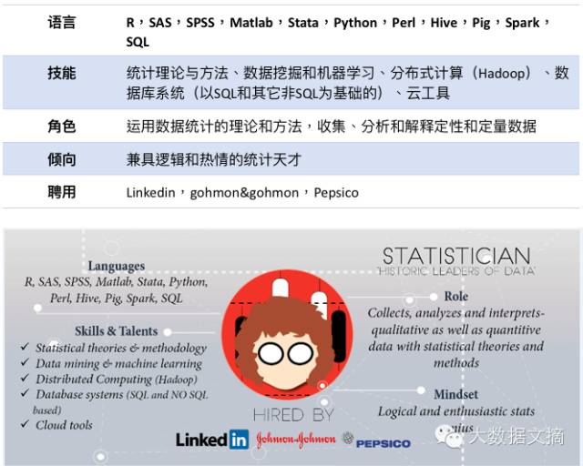 统计学家的头衔是经常被忽视的,或者会被听上去更时髦的头衔所代替。这是令人遗憾的,因为统计学家具有坚实的统计理论和方法基础,他们应该被看成数据科学领域的先驱。通常,他们是从数据中收获信息,然后把信息转化为可操作的见解。尽管这个头衔和今天所提到的其它头衔相比并不那么响亮,现代统计学家们却总是能够快速赶上科技前进的步伐,并将其应用于他们的研究。