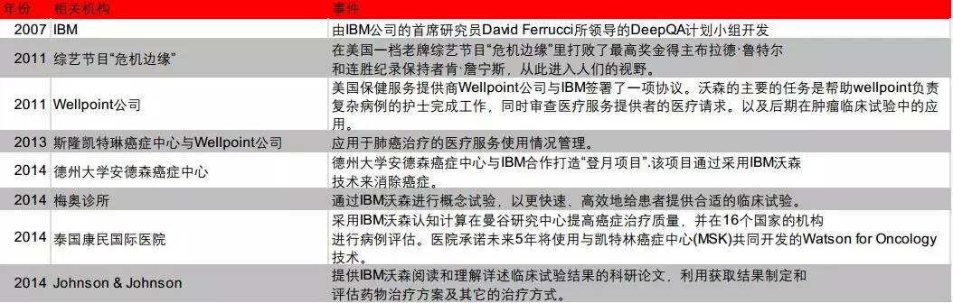 2011年Watson机器人发布,击败人类赢得美国智力问答节目《危险地带》的冠军。但是,仅仅赢得智力问答比赛不代表它是一个非常有效的商业模式,也不足以证明Watson系统值得投资。随后,沃森获得第一份工作,帮助wellpoint负责复杂病例的护士完成工作,同时审查医疗服务提供者的医疗请求。以及后期在肿瘤临床试验中的应用。