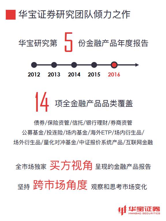 作为华宝证券研究团队的年度之作,在2016年金融产品年度报告力争呈现出最具前瞻性的视角。印制成册的《中国金融产品年度报告》更加注重我国乃至全球宏观经济背景和政策形势的分析与理解;加重了海外资产配置部分的笔墨;并且在分项内容中提出了场内场外期权联动研究机制、修正隐含收益率等多项创新研究成果。