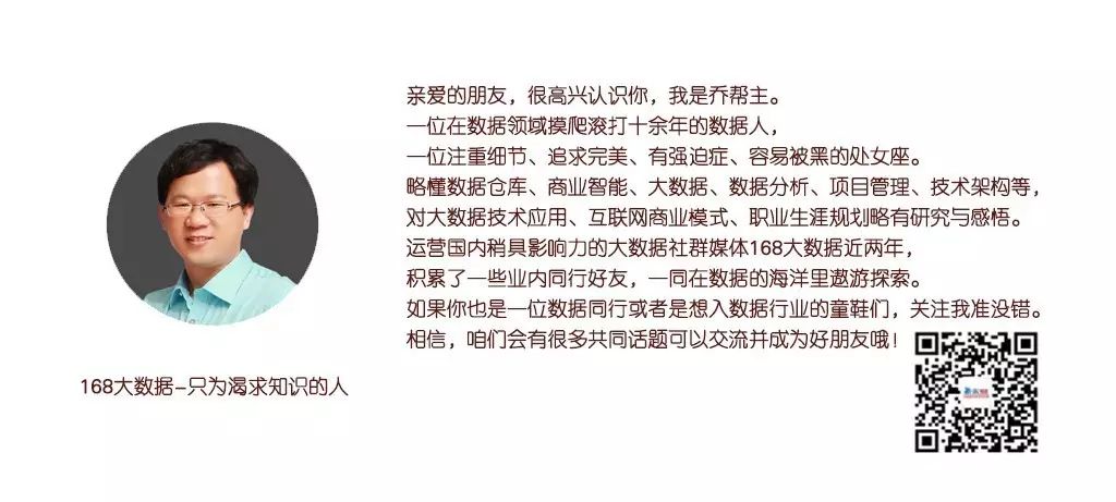 168大数据 www.bi168.cn 是国内最具影响力的学习型大数据社群媒体,是专注大数据、商业智能、数据分析、云计算、人工智能等领域的深度交流、知识分享社区与职业发展平台,以大数据驱动创业创新和助力传统产业转型升级为使命,致力于为大数据产业链的人才、传统企业、厂商/服务商提供最具价值的资讯、服务与链接。社区聚集了国内外近十万数据领域的创始人CEO、首席技术官、首席数据官、数据科学家、大数据工程师、BI工程师等数据精英,共同致力于大数据技术、大数据价值、大数据思维的传播、交流与分享。
