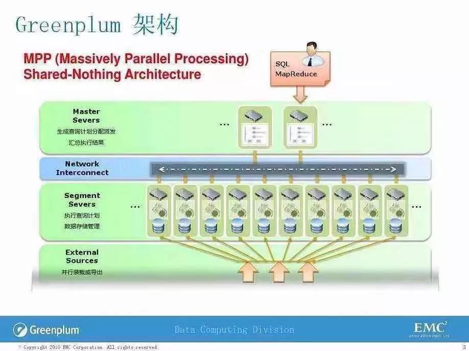 MPP (Massively Parallel Processing),即大规模并行处理,在数据库非共享集群中,每个节点都有独立的磁盘存储系统和内存系统,业务数据根据数据库模型和应用特点划分到各个节点上,每台数据节点通过专用网络或者商业通用网络互相连接,彼此协同计算,作为整体提供数据库服务。非共享数据库集群有完全的可伸缩性、高可用、高性能、优秀的性价比、资源共享等优势。简单来说,MPP是将任务并行的分散到多个服务器和节点上,在每个节点上计算完成后,将各自部分的结果汇总在一起得到最终的结果。下面以典型的MPP产品Greenplum架构为例。