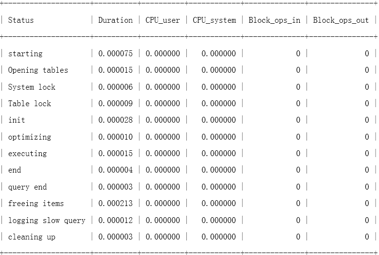 SELECT STATE,SUM(DURATION) ASTotal_R,ROUND(100*SUM(DURATION)/(SELECT SUM(DURATION) FROM INFORMATION_SCHEMA.PROFILINGWHERE QUERY_ID=@query_id),2) AS Pct_R,COUNT(*) AS Calls,SUM(DURATION)/COUNT(*)AS "R/Call"