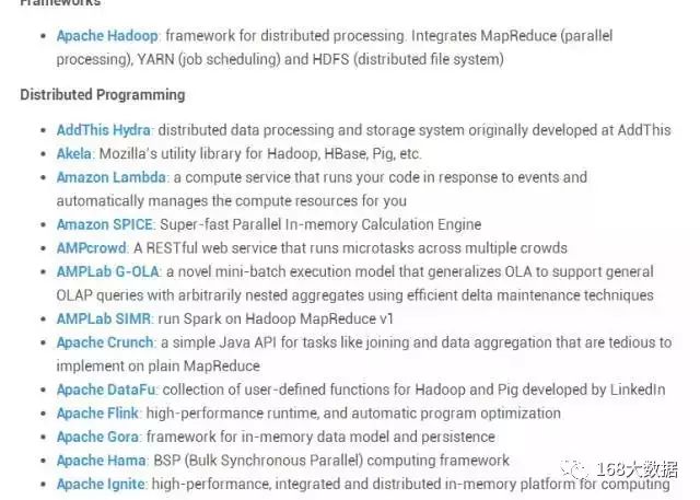 从框架、分布式编程、分布式文件系统、键值数据模型、图数据模型、数据可视化、列存储、机器学习等