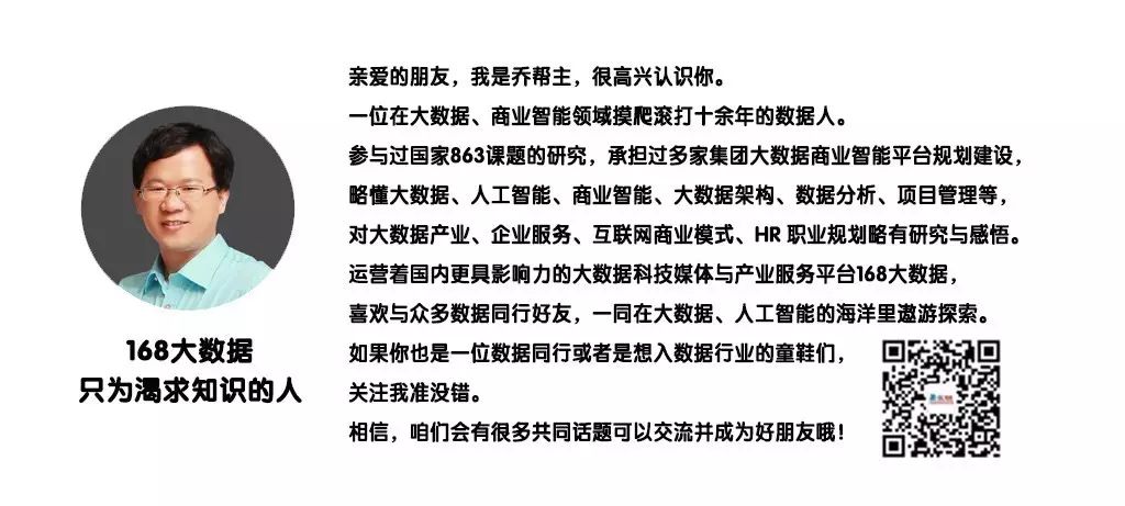 欢迎关注168大数据微信公众号,我们是专注于大数据、人工智能AI、商业智能BI、数据分析、数据仓库、数据治理等数据科学领域领域的垂直社区与媒体,致力于成为大数据智能产业的创新服务平台。