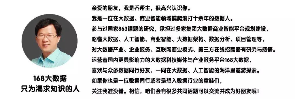 168大数据 www.bi168.cn 是国内更具影响力的数据科学社区媒体与产业创新赋能平台,专注大数据、人工智能、商业智能、数据分析、云计算等数据科学领域的深度交流、知识分享、职场社交和职业发展,以大数据驱动创业创新和助力传统产业转型升级为使命,致力于为大数据产业的从业者、传统企业、厂商、服务商提供最具价值的资讯、服务、连接与产业研究。平台聚集了国内外近十万数据领域的大数据企业创始人、首席信息官、首席技术官、首席数据官、数据架构师、数据科学家、人工智能专家、商业智能专家等精英,共同致力于大数据技术、大数据价值、大数据思维的传播、交流与分享。