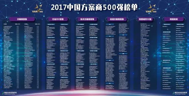 2017中国方案商500强榜单,由以下部分组成。一是按2016年营业额排序的中国方案商百强;二是行业ISV百强,三是技术方案商百强,四是区域方案商百强;五是智慧城市50强;六是特别奖项。本次榜单覆盖的行业和技术领域包括:电信、金融、政府、公共安全、电力、医疗、教育、轨道交通、制造、媒资;IT咨询服务、云计算、物联网、大数据、商业智能、人工智能、协作通信、安全、文印服务、存储等。