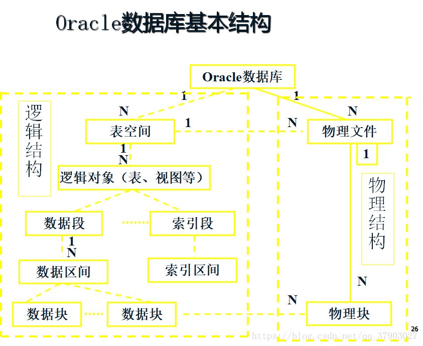 Oracle数据库是一个被统一处理的的数据的集合,从物理角度来看包括三类文件数据文件,控制文件,重做日志文件。从逻辑角度来看,Oracle数据库至少包含一个表空间,表空间至少包含一个段,段由区做成,区有块组成。需要注意的是表空间可以包含若干个数据文件,段可以跨同一个表空间的多个数据文件,区只能在同一个数据文件内。