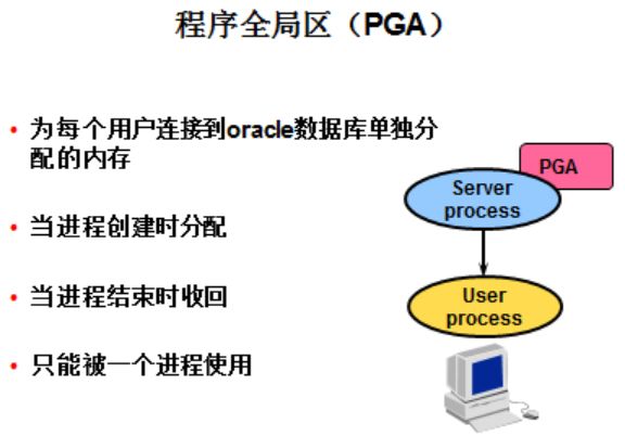 PGA:包含单个服务器进程或单个后台进程的数据和控制信息,与几个进程共享的SGA正相反,PGA 是只被一个进程使用的区域,PGA在创建进程时分配,在终止进程时回收.