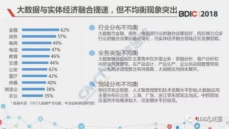 值得一提的是,大数据与实体经济的融合正不断加速,但不均衡现象日益突出。白皮书指出,这种不均衡体现在行业分布不均衡、业务类型不均衡、地域分布不均衡三个方面。