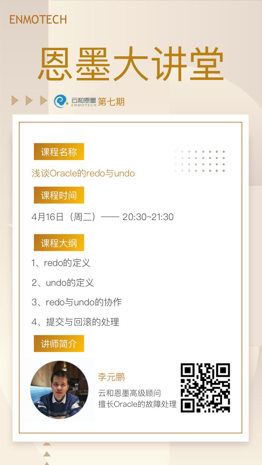 本期大讲堂,李元鹏老师将从实战出发,与大家交流Oracle中redo与undo的那些事。点击阅读原文立即报名!