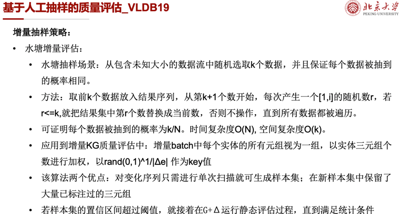对于演化知识图谱的评估,文章提出了两种增量抽样评估方式,希望能够利用尽可能多的已标注样本对新图谱的准确率进行评估。第一种方法借鉴了经典水塘抽样(RS)的思路,将增量batch中每个实体的所有元组视为整体,根据三元组个数进行加权,计算key值确定选取的样本,并通过理论分析确定新抽取的样本数量不会太多。第二种是分层增量评估(SS),将图谱的增量视为一个单独的层,在其上使用两阶段加权抽样后与之前若干层的结果加权,直到置信区间小于阈值。这种方法的优点在于完全利用了前面所有的评估结果,因而效率更高。