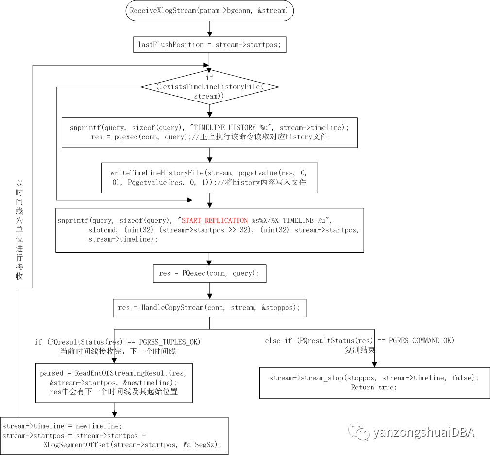 这个是一个子进程处理的内容,根据日志起始时间线及位置初始化流复制结构StreamCtl,然后调用函数ReceiveXlogStream进行流复制接收日志文件。