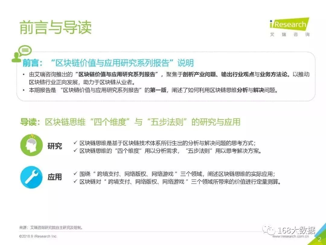 《冥古宙-区块链思维研究报告》是由艾瑞咨询推出的“区块链价值与应用研究系列报告“的第一版。报告从技术价值与应用的角度阐述了什么是区块链思维,并提出了利用区块链思维分析问题的"四个维度"与解决问题的"五步法则"。以" 跨境支付、网络版权、网络游戏 "三个领域为例,展开对"四个维度"与"五步法则"的实际应用,并对区块链为这三个领域带来的价值进行了分析与测算。