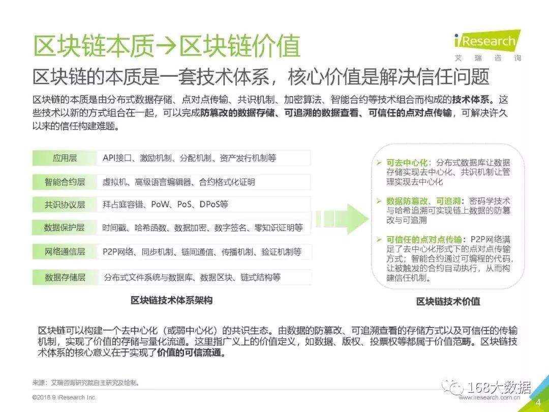 区块链的本质是由分布式数据存储、点对点传输、共识机制、加密算法、智能合约等技术组合而构成的技术体系。这些技术以新的方式组合在一起,可以完成防篡改的数据存储、可追溯的数据查看、可信任的点对点传输,可解决许久以来的信任构建难题。区块链可以构建一个去中心化(或弱中心化)的共识生态。由数据的防篡改、可追溯查看的存储方式以及可信任的传输机制,实现了价值的存储与量化流通。这里指广义上的价值定义,如数据、版权、投票权等都属于价值范畴。区块链技术体系的核心意义在于实现了价值的可信流通。