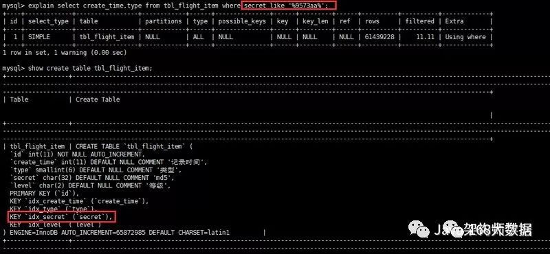如下图所示,虽然给secret字段添加了索引,但在explain结果果并没有使用