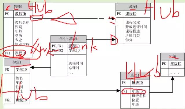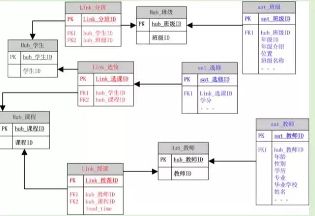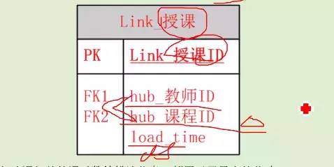 链接表用来描述中心表间的关联关系,亦不包含业务键值以及数据装载描述以外的任何非键值数据,比如:学生授课链接表,其设计: