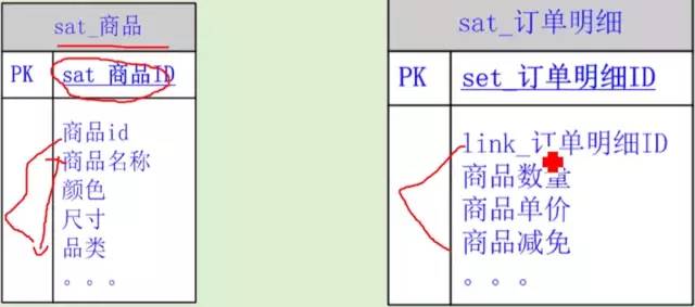 数仓中数据的主要载体,包括对链接表、中心表的数据描述、数值度量等信息,中心表商品、订单明细的卫星表分别如下: