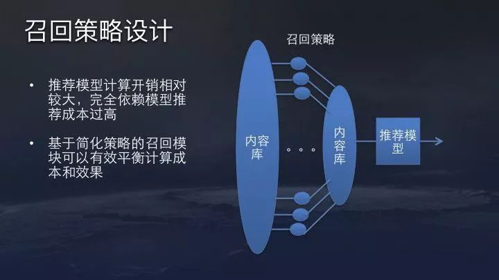 所以需要设计一些召回策略,每次推荐时从海量内容中筛选出千级别的内容库。召回策略最重要的要求是性能要极致,一般超时不能超过50毫秒。