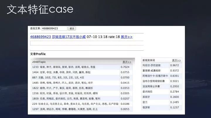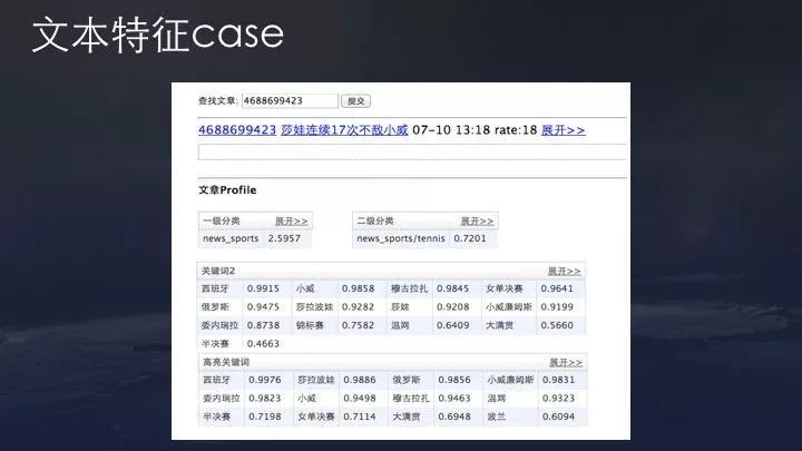 上图是今日头条的一个实际文本case。可以看到,这篇文章有分类、关键词、topic、实体词等文本特征。