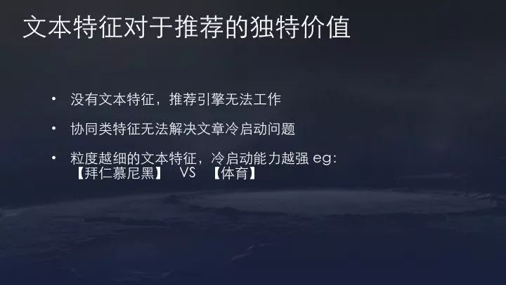 但对资讯类产品而言,大部分是消费当天内容,没有文本特征新内容冷启动非常困难,协同类特征无法解决文章冷启动问题。
