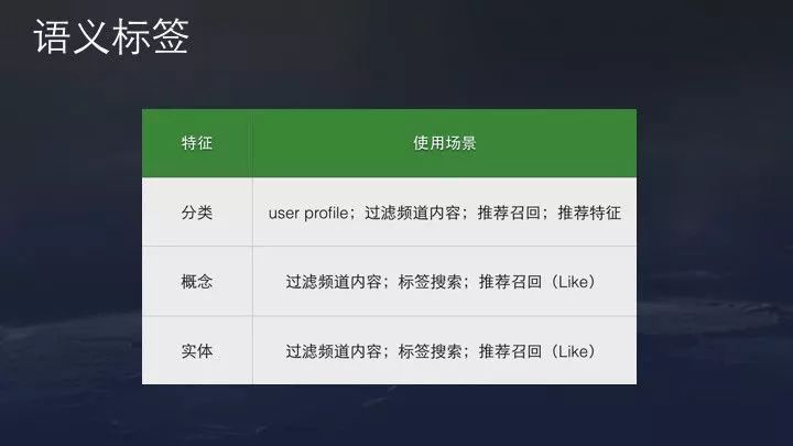 上图是头条语义标签的特征和使用场景。他们之间层级不同,要求不同。