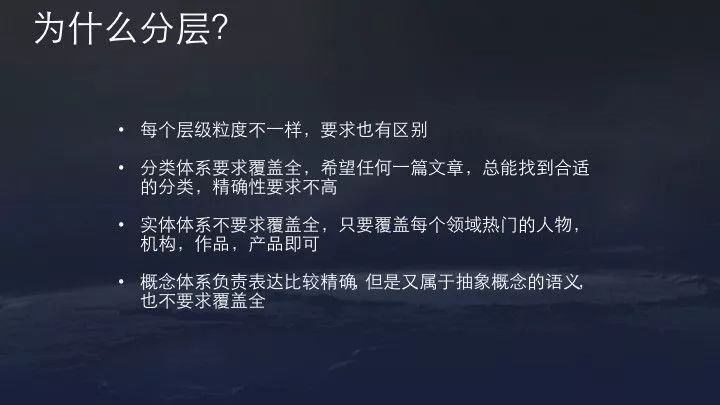 概念体系则负责解决比较精确又属于抽象概念的语义。这是我们最初的分类,实践中发现分类和概念在技术上能互用,后来统一用了一套技术架构。