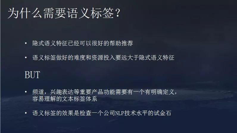 有一些产品上的需要,比如频道需要有明确定义的分类内容和容易理解的文本标签体系。语义标签的效果是检查一个公司NLP技术水平的试金石。