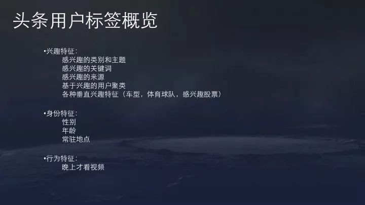 今日头条常用的用户标签包括用户感兴趣的类别和主题、关键词、来源、基于兴趣的用户聚类以及各种垂直兴趣特征(车型,体育球队,股票等)。还有性别、年龄、地点等信息。