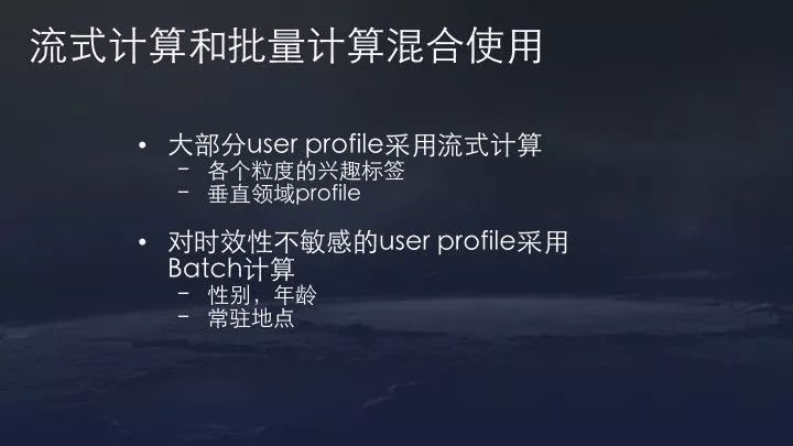 当然,我们也发现并非所有用户标签都需要流式系统。像用户的性别、年龄、常驻地点这些信息,不需要实时重复计算,就仍然保留daily更新。
