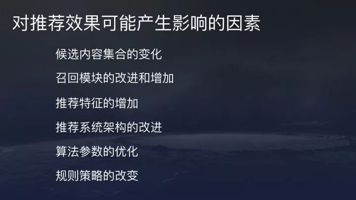 事实上,很多因素都会影响推荐效果。比如侯选集合变化,召回模块的改进或增加,推荐特征的增加,模型架构的改进在,算法参数的优化等等,不一一举例。