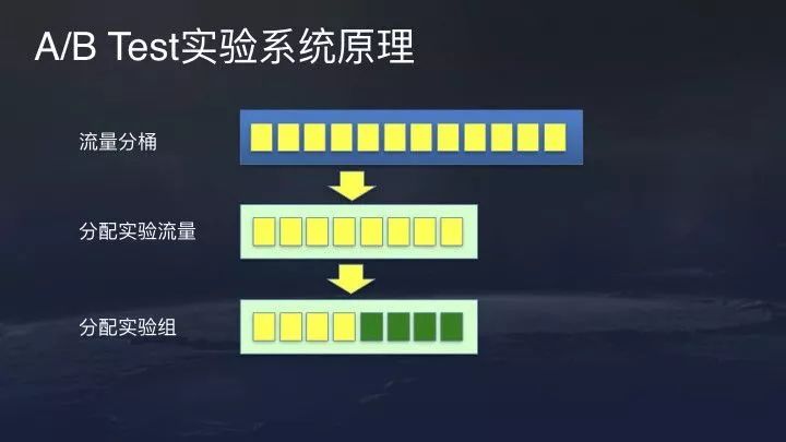 这是头条A/B Test实验系统的基本原理。首先我们会做在离线状态下做好用户分桶,然后线上分配实验流量,将桶里用户打上标签,分给实验组。