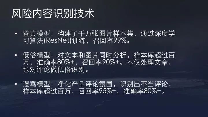 分享内容识别技术主要鉴黄模型,谩骂模型以及低俗模型。今日头条的低俗模型通过深度学习算法训练,样本库非常大,图片、文本同时分析。