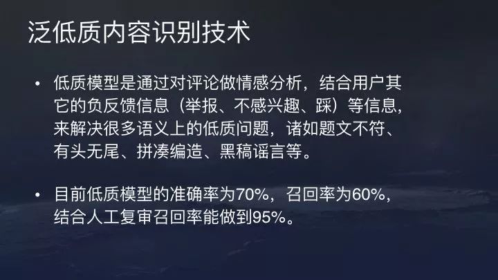 泛低质识别涉及的情况非常多,像假新闻、黑稿、题文不符、标题党、内容质量低等等,这部分内容由机器理解是非常难的,需要大量反馈信息,包括其他样本信息比对。