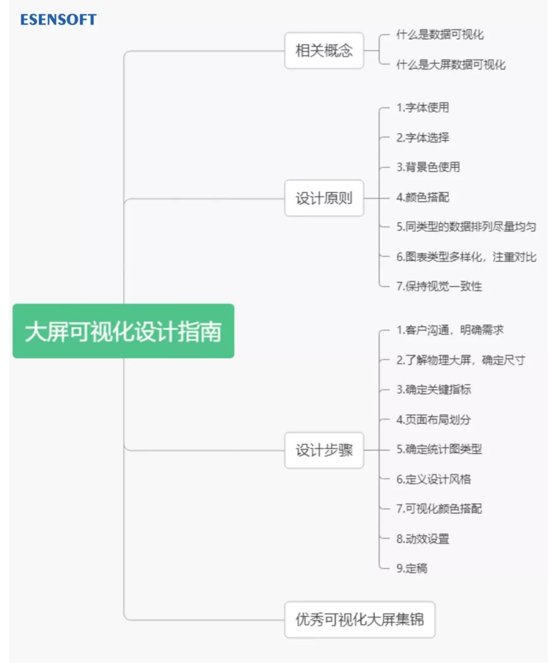 主次分明、条理清晰、注意留白,合理利用大屏上各个小的显示单元,并尽量避免关键数据被拼缝分割。这一点要求我们注意视线的移动规律。比如横向排版的信息,人们一般会首先注意左上角。因此,标题一般出现在这个位置。看过左上角之后,用户的视线会往右下方移动。我们在排版布局的时候,应该遵循视线的移动规律,人眼在观察物体的时候,目光不会只聚焦在一点上,而是会覆盖焦点周边的一片区域。把时间的流逝感和视线的移动相结合,就能产生更好的效果。选定图表注意事项:易理解、易实现;图表类型选择,可以参考亿信华辰酷屏统计图,百余种统计图组件,任君选择。易理解:要考虑大屏最终用户,可视化结果应该是一看就懂,不需要思考和过度理解,因而选定图表时要理性,避免为了视觉上的效果而选择一些对用户不太友好的图形。易实现:某些效果用设计工具可以轻易实现,但开发要用代码落地却非常困难,所以大屏设计中一定要善用工具,切忌不计成本,埋头苦作。统计图的基础就是数据,所以在进行统计图选择时候,最重要就是要符合业务场景中数据的特点。这里根据归结图表的特点,汇总出一张思维导图,帮助大家更快地选择展现数据特点的图表类型。