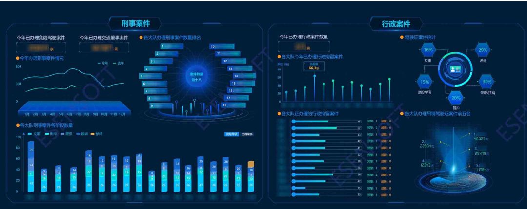 保持整体色彩感觉一致,配色风格一致,不同颜色之间搭配协调。不要一会黑白配,一会又来个红绿配。 图标、图像的视觉风格以及尺寸一致,和整体风格保持一致。按钮的风格要统一,要么都是填充式的,要么都是中空式的,要么都是棱角分明,要么都是圆润光滑。例如下图,某公安行业可视化大屏(部分)是个很好的例子,配色统一,风格一致。