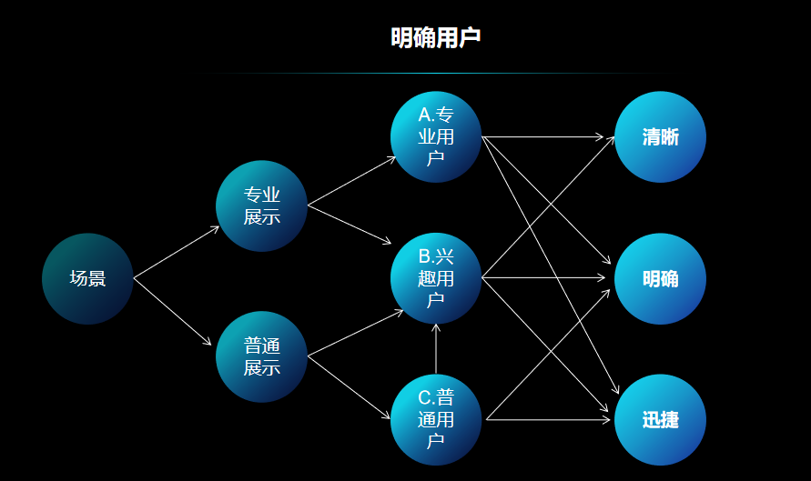 整体项目是利用大屏设备进行相关数据及图表展示,我们预想将项目应用的场景分为两种情况:1.专业展示:参与商务活动、分享或为某些团体进行讲解及展示使用。A. 专业用户:即参加商务活动、分享等,需了解具体数据内容的用户。此类用户会较为细致的查看每项数据;B. 兴趣用户:即无论数据在何处展示,其对数据都有浓厚的兴趣,会去驻足停留,仔细观看及分析数据。C. 普通用户:即匆匆过往的人群。这部分用户可能只会在屏幕前短暂停留。将场景和用户进行分类后,就可以进一步根据他们的需求,进行需求可视化大屏的归集。大屏一般分辨率比较高,如果不事先确定物理大屏尺寸,设计稿设计出来的效果被投放到大屏上就会有偏差失真。一般情况下,确定设计稿尺寸需要分两种情况:当投屏电脑与与大屏系统尺寸比例、分辨率一致时,设计稿的尺寸、分辨率以投屏电脑为准;当投屏电脑与与大屏系统尺寸比例、分辨率不一致时,设计稿的尺寸、分辨率以物理大屏为准;所以,一般我们也不建议大屏用自适应方式,如果是自适应,系统就会按各自模块的宽高比先计算实际值,一旦大屏内容布局较多或指标计算复杂,则会非常影响大屏计算性能和实时分析能力。关键指标是一些概括性词语,是对一组或者一系列数据的统称。一般情况下,一个指标在大屏上独占一块区域,所以通过关键指标定义,我们就知道大屏上大概会显示哪些内容以及大屏会被分为几块。