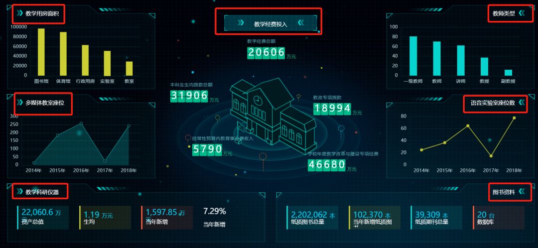 以学校校情大屏为例:这里的关键指标是教学经费投入、教学用房面积、多媒体教室座位等。