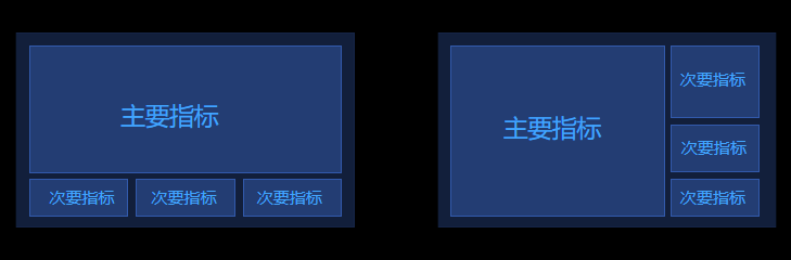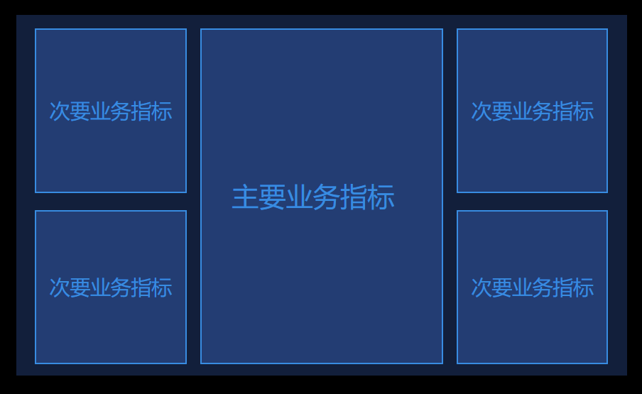 确定关键指标后,根据业务需求拟定各个指标展示的优先级(主、次、辅)。主要关键指标:主要指标位于屏幕中央,多维动效丰富的地图或者其他尺寸和关键指标确立后,接下来要对大屏进行布局和页面的划分。这里的划分,主要根据我们之前定好的业务指标进行,核心业务指标安排在中间位置、占较大面积;其余的指标按优先级依次在核心指标周围展开。一般把有关联的指标让其相邻或靠近,把图表类型相近的指标放一起,这样能减少观者认知上的负担并提高信息传递的效率。