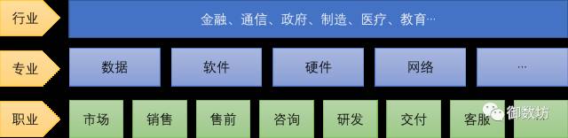 行业维度在三个维度中可能是最重要的一个,因为IT从业时间很久之后,会发现专业能力、职业能力相对容易快速培养和掌握,而一个行业的业务知识、行业信息化建设历程、行业人脉,是需要经过多年学习和实战积累才能有所沉淀,这也是为什么无论在甲方还是乙方企业,懂业务的IT专家或者是懂IT的业务专家最吃香。