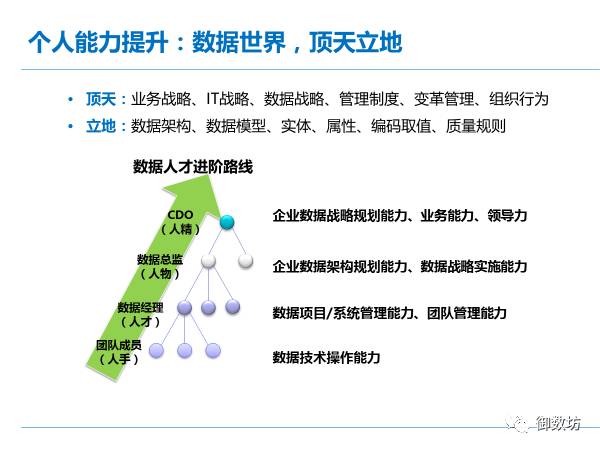 成就期:再往上,那就真正做到了企业级数据领导——CDO,需要有数据战略的规划能力,能够和业务部门领导、公司其他C-Level领导有更好的沟通,去综合统筹一家企业的数据治理、数据利用、数据架构等数据工作。CDO在国内传统企业中还几乎没有设置,在国际上也属于很新的角色,晋级到这个段位的选手,一定是业务、数据、技术、管理多方面的综合型人才,此外可能还需要在一家企业内有深厚的人脉积累——在任何一个组织进行变革管理,政治资历不足是万万行不通的。国外企业的CDO职业也处于早期发展阶段。因此,多以有数据背景的专业人才空降到一家企业,但是任期多不长久(2年以内居多),这也许也是因为在企业的资历不足吧。当企业掌握了数据治理专业能力之后,由深谙企业内部关系的“老人”上位,也许更能保证工作的持续推动。