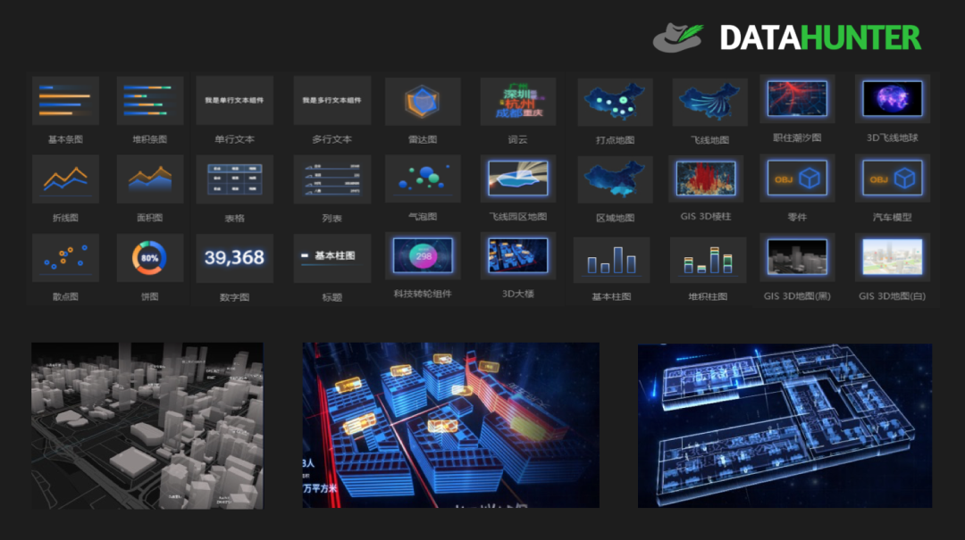 Data MAX 是DataHuner自主研发的、基于浏览器的、用于配置数据可视化大屏的工具平台。它提供了丰富的可视化设计组件,通过简单的点击、拖拽等操作,即可进行图表布局的调整,只要几分钟就可以配置出一页炫酷的可视化大屏。