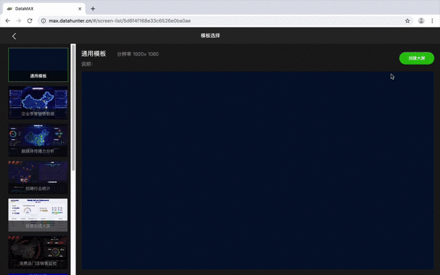 与此同时,Data MAX 预置了诸多不同风格、不同类型的大屏模板,每个模板都是一个标准的风格包。用户可以直接按需调用相应的模板进行更改,快速生成新的大屏页面。下面我们一起来看下: