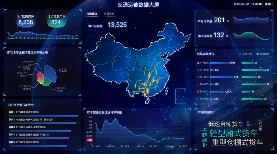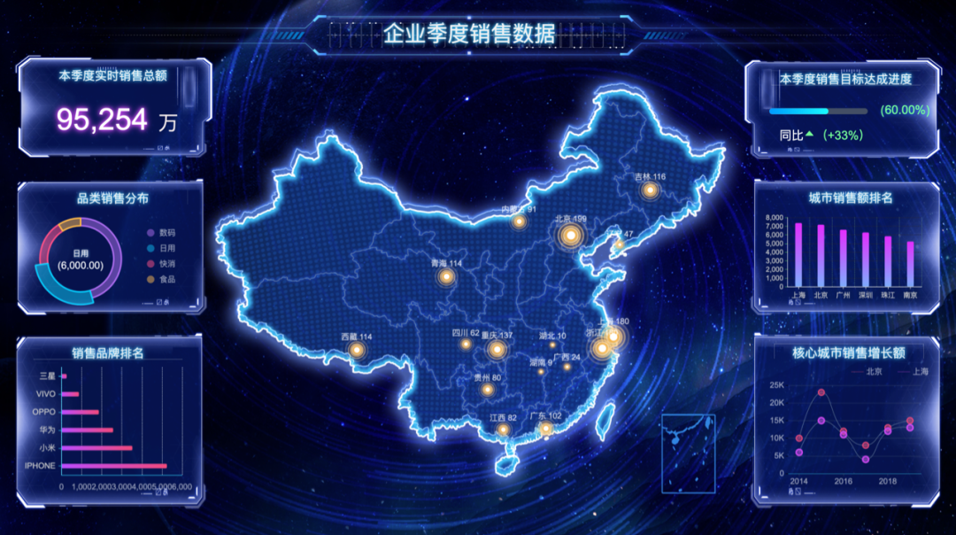 很多人对数据大屏的第一印象就是炫酷,但其实一张合格的数据大屏不只是效果酷炫,特效满满而已。数据大屏主旨在于借助于图形化手段,清晰有效地传达与沟通信息。那么,“清晰有效”才是数据大屏的重点。