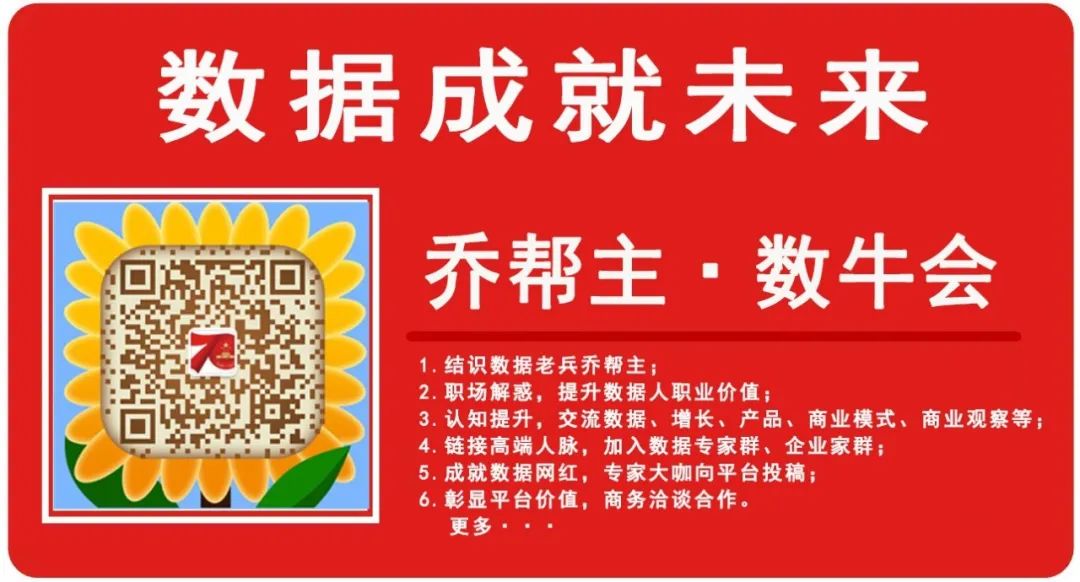 | 数牛会即数据从业者社群,链接大咖,分享实践。特设数字企业家(DT创始人/传统企业家)、首席数据官(CDO/CIO/CGO/COO)、数据精英综合群、数据中台与数据治理(DW与BI)、数据产品经理、数据科学家(数据分析师/数据工程师/机器学习)、阿里云ACP认证、百万年薪职场进阶群,文末扫码入群,请备注姓名/公司/职位。 |