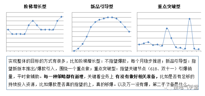 第一步:共识整体目标,制定整体战术。各个运营小组,共识年度大部门整体目标(比如DAU、转化率、销售金额等),并且选择落地大目标的战术,把大目标分解到各个月。注意:分解方法和不一定是按月平均,或按过往趋势分摊。分解方法可能和战术选择有关(如下图)