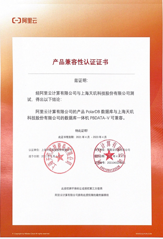 其中,天玑科技产品【PBData-V】也与【阿里云POlarDB数据库】共同完成互兼容适配认证,共同推进企业数字化转型和商业创新。