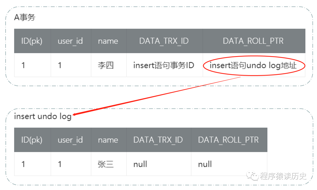 c、在将【张三】改为【李四】,同时在DATA_TRX_ID列记录insert事务的ID,并且DATA_ROLL_PTR列则指向上一步的undo log地址。